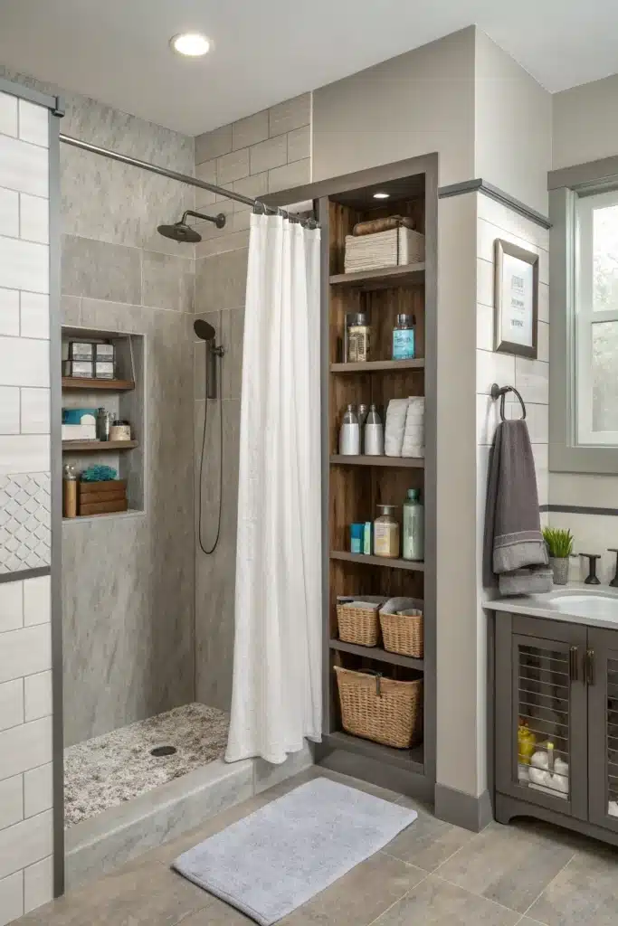 Transform your shower area into an organized storage zone with built-in and hanging solutions that keep everything accessible.