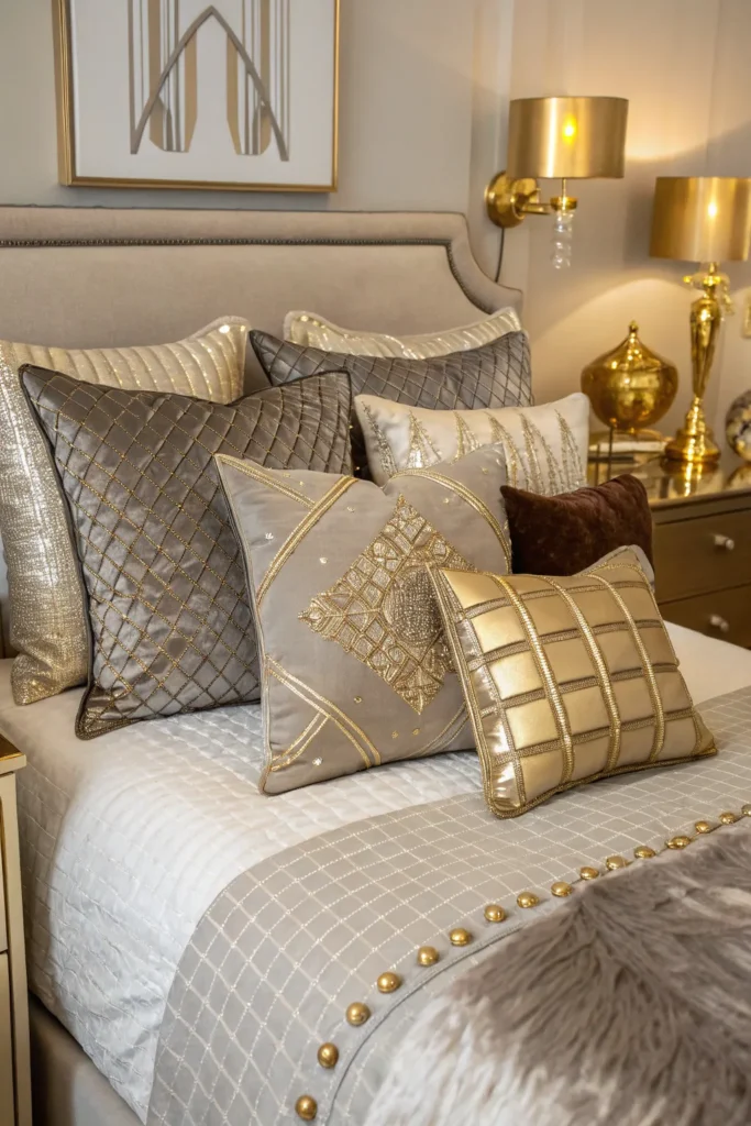 Throw pillows offer an easy and affordable way to upgrade your space. Choose metallic, velvet, beaded, or embroidered designs that add shine and texture. Mix and match sizes and shapes, but stick to a coordinated palette to avoid overwhelming the small room. Metallic pillows instantly elevate your bedding and tie in with other glam elements like gold lamps or mirrored furniture.