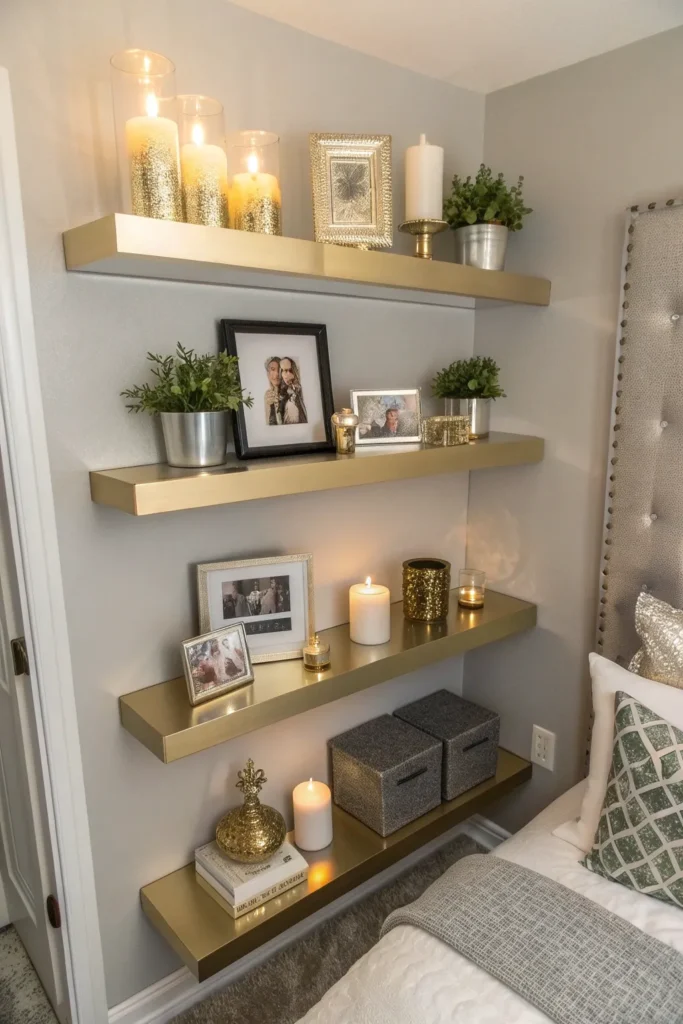 Floating shelves add storage while keeping the room visually open—perfect for smaller bedrooms. Choose shelves with glossy or metallic finishes to maintain the glam theme. Style them with candles, framed photos, small plants, or decorative boxes. Floating shelves also create vertical storage, freeing up floor space and helping your bedroom feel more spacious and organized.