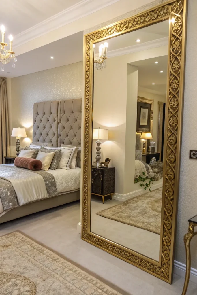 A large wall mirror or floor mirror expands the room visually and adds dramatic glam. Mirrors reflect light and create the illusion of extra square footage—ideal for small bedrooms. Choose mirrors with decorative frames such as gold, silver, or mirrored borders. Leaning a tall mirror against the wall also gives the space a modern boutique look.