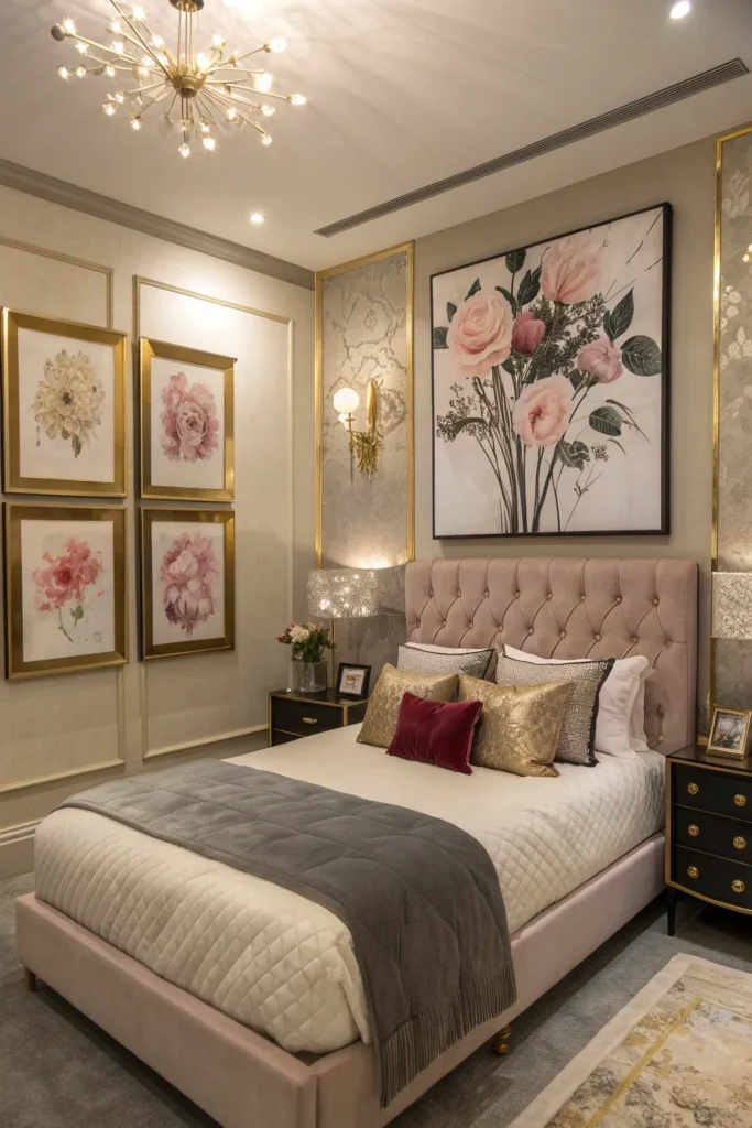 Artwork completes the glam look. Choose abstract art, metallic prints, fashion-inspired pieces, or soft, romantic designs. Oversized art creates a statement, while smaller gallery walls add personality. Frames in gold, black, or mirrored finishes keep the glam theme cohesive. Art brings sophistication, color, and a personal touch that elevates your bedroom’s overall aesthetic.