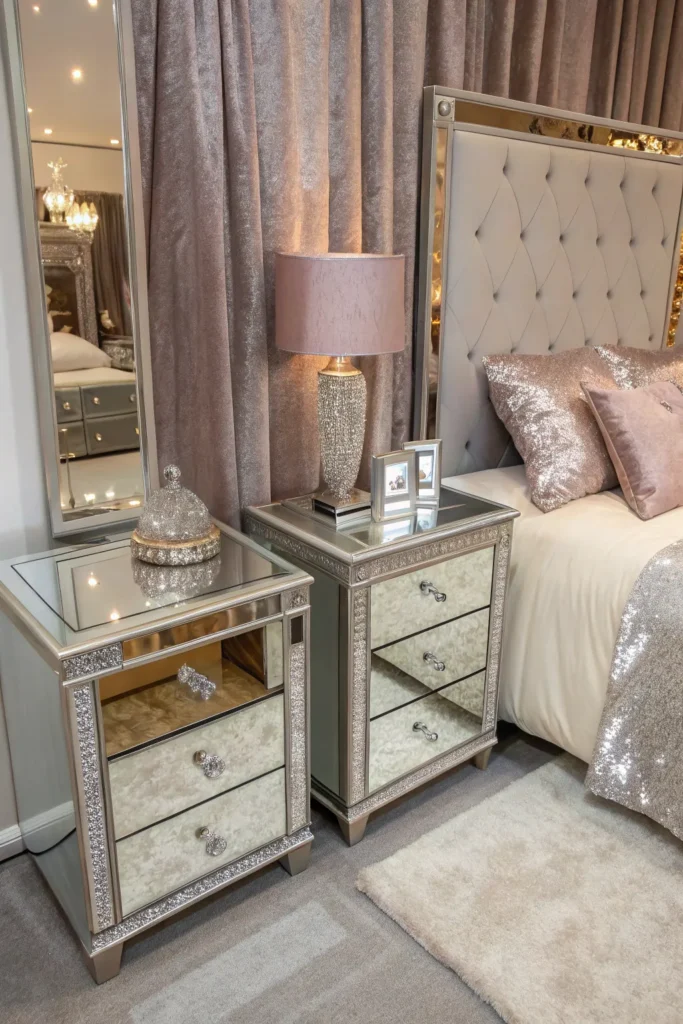 Mirrored nightstands, dressers, or vanity tables add instant sparkle to your bedroom. These reflective surfaces bounce light around the room, making it appear brighter and more spacious. This is especially helpful in small bedrooms where natural light may be limited. Mirrored furniture pairs well with metallic accents and soft textures, creating a cohesive glam look. Even a single mirrored nightstand can elevate the overall style without overwhelming the space.