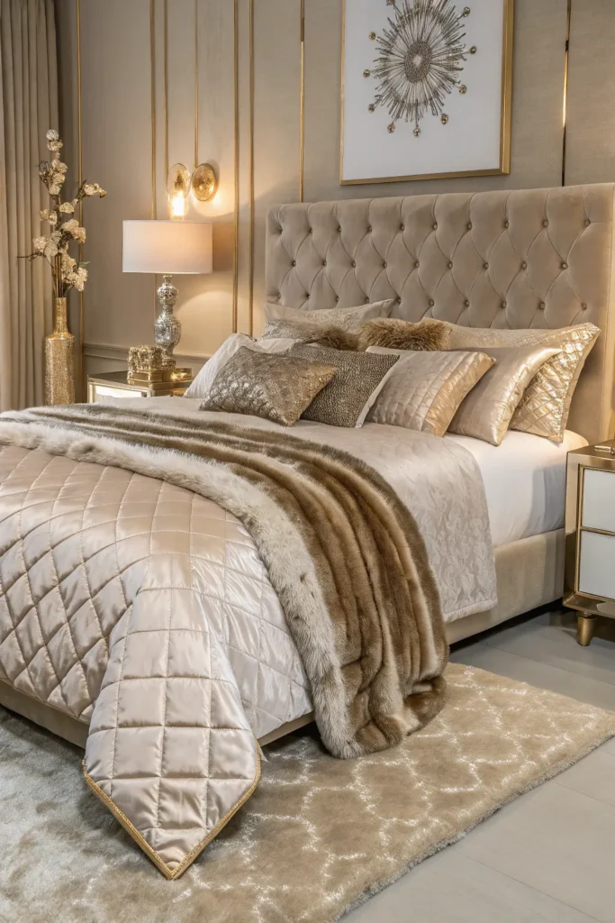 High-quality bedding transforms the feel of your bedroom instantly. For a glam aesthetic, consider satin or silk sheets, velvet duvets, or quilts with subtle shimmer. Layering is key—add plush throw pillows in metallic shades and a faux fur or knitted throw at the foot of the bed. These elements add depth and texture, making the bed look inviting and luxurious. Stick to a cohesive color palette such as gold and cream, black and silver, or blush and rose gold.