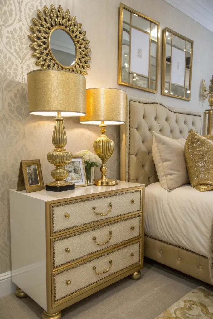 Matching lamps on either side of the bed create symmetry, which instantly feels polished and luxurious. Choose lamps with marble bases, crystal details, or metallic finishes. This symmetry not only enhances the glam style but also provides balanced lighting. Soft white or warm LED bulbs create a cozy yet sophisticated glow.