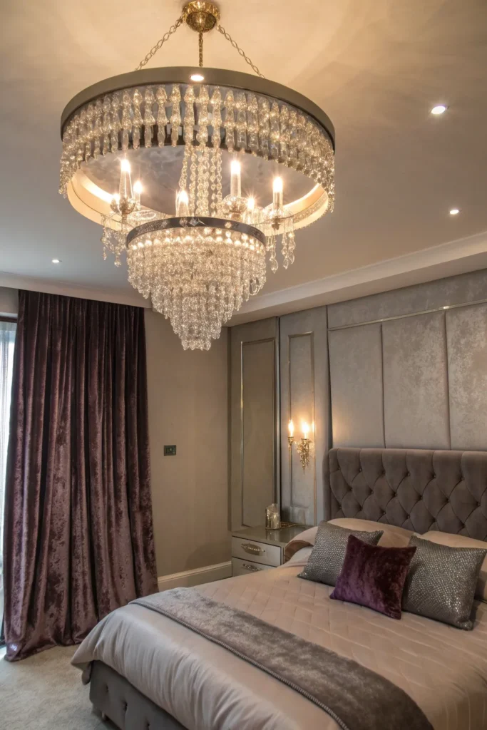 Lighting plays a major role in setting the mood. Replace standard ceiling lights with a small crystal chandelier or a modern metallic pendant to add sparkle. Glam chandeliers cast beautiful reflections that enhance the sophisticated atmosphere of your bedroom. Choose compact designs that complement the scale of your room. Pair the chandelier with dimmable bulbs so you can adjust the ambiance from bright and lively to soft and romantic.