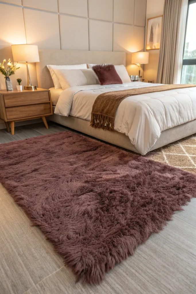 A plush rug instantly makes a space feel warm and luxurious. Faux fur, shag, or thick pile rugs add texture and softness, especially helpful if your bedroom has hardwood or tile floors. Light-colored rugs brighten the room, while deeper hues add drama. Place the rug partially under the bed to visually anchor the space. Even a small area rug beside the bed can make your room feel more expensive and inviting.