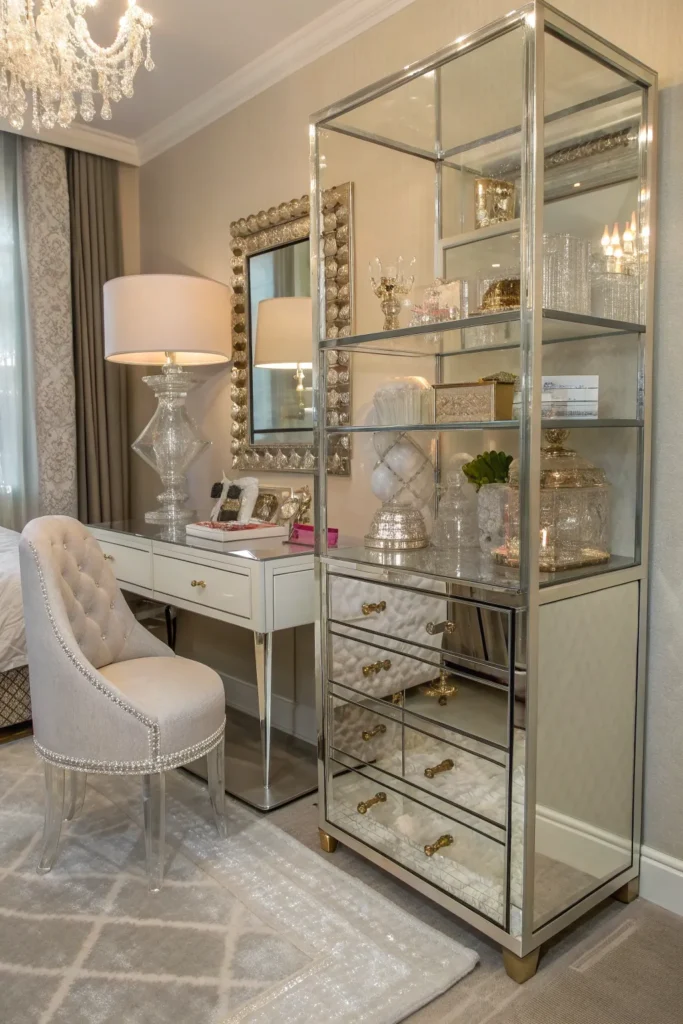 Lucite and glass pieces add a modern glam touch while keeping your bedroom visually light. Because they’re transparent or reflective, they don’t clutter the room or make it feel cramped. Consider a glass bedside lamp, a clear vanity chair, or acrylic shelving. These items also complement metallic finishes and soft textiles beautifully, balancing glam elegance with modern minimalism.