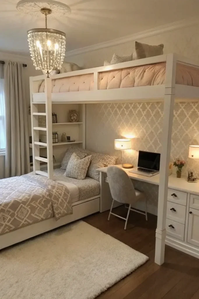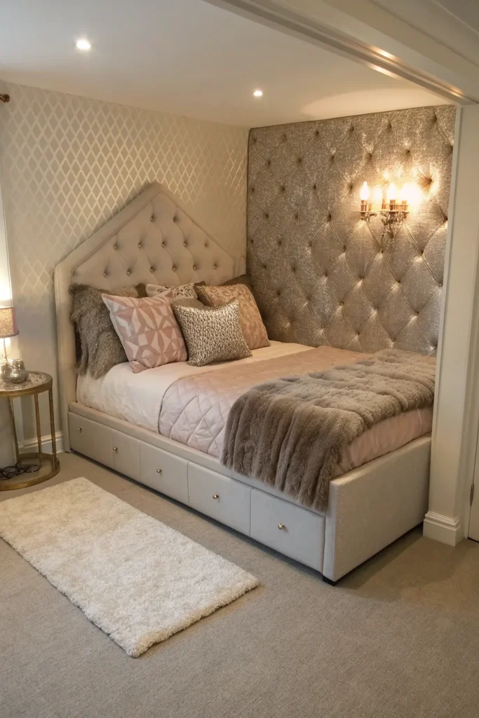 If your bedroom has enough ceiling height, consider a lofted or raised bed. This layout frees up valuable space underneath for a desk, storage area, or seating nook. In extremely small rooms, a raised bed setup can double your usable floor space, making the room feel bigger and multi-functional.