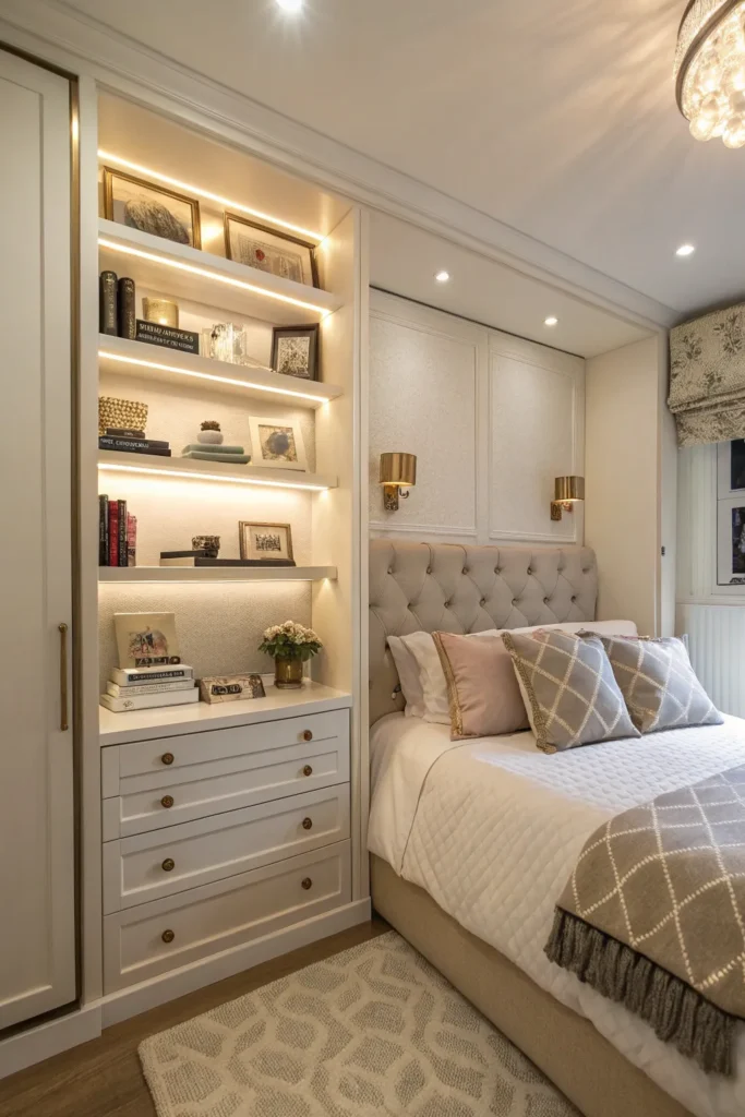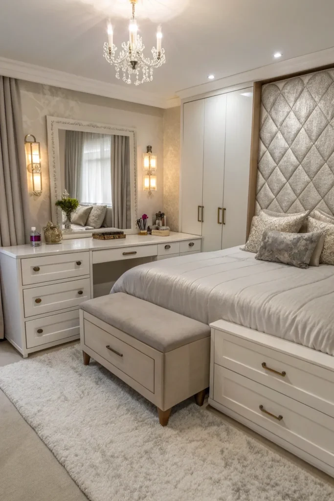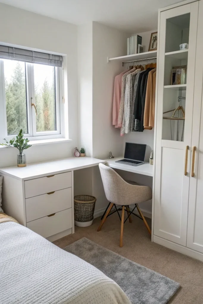 Corners are often overlooked but incredibly useful in small bedroom layouts. A compact corner desk, vanity, or floating shelf station fits neatly without obstructing movement. Pair it with a clear or backless chair to avoid visual heaviness. This setup is especially useful for students, freelancers, or beauty lovers who need a functional workspace.