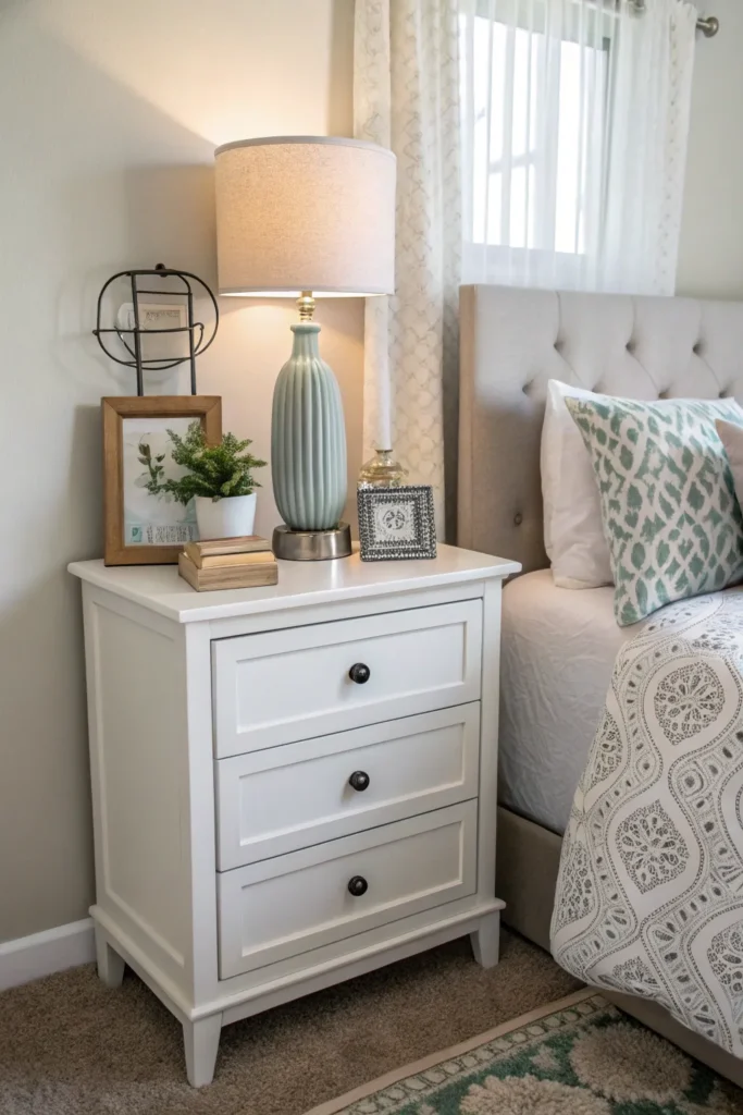 Use trays or small containers to group essentials neatly. When surfaces stay mostly clear, the entire bedroom feels larger, calmer, and more restful.