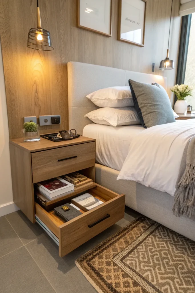 Opt for designs with a single drawer or hidden compartment to store bedside essentials. Floating nightstands make the room feel more open and help maintain a clean, uncluttered look.