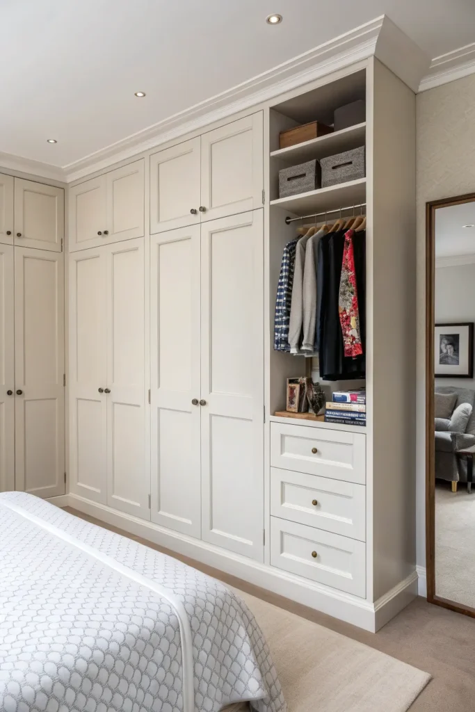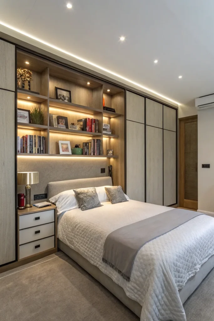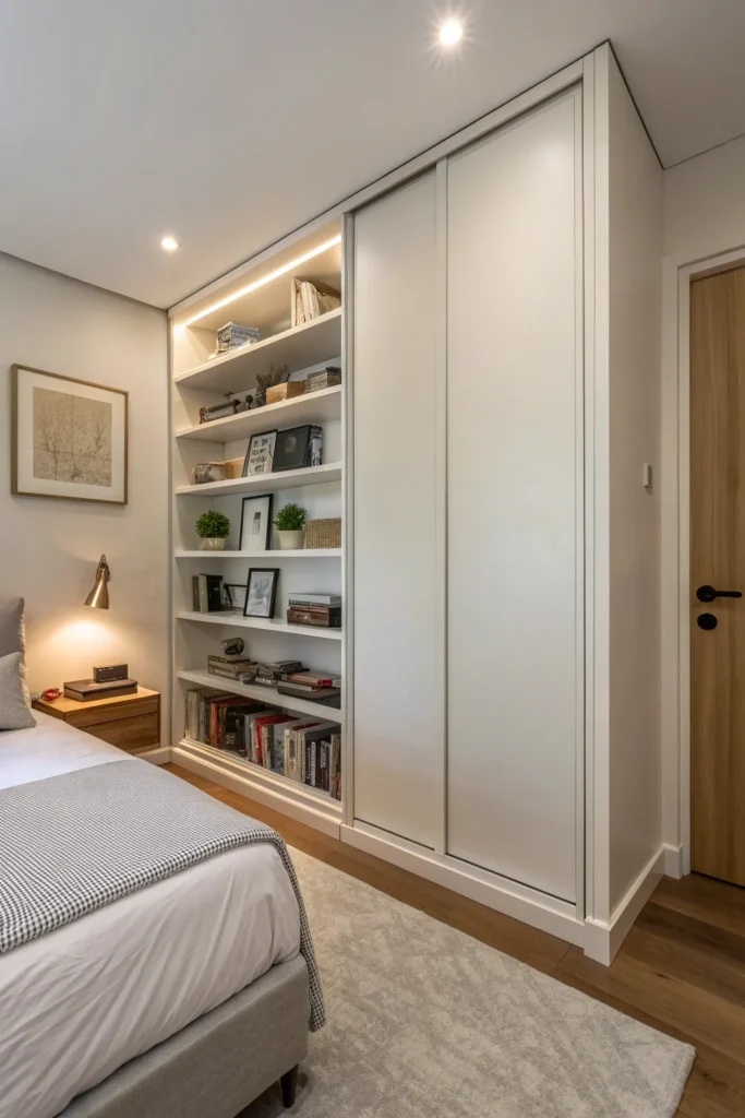 Built-in wardrobes that sit flush with the wall help a small bedroom feel calm and cohesive. Flat-panel doors without heavy detailing blend into the architecture, reducing visual noise.