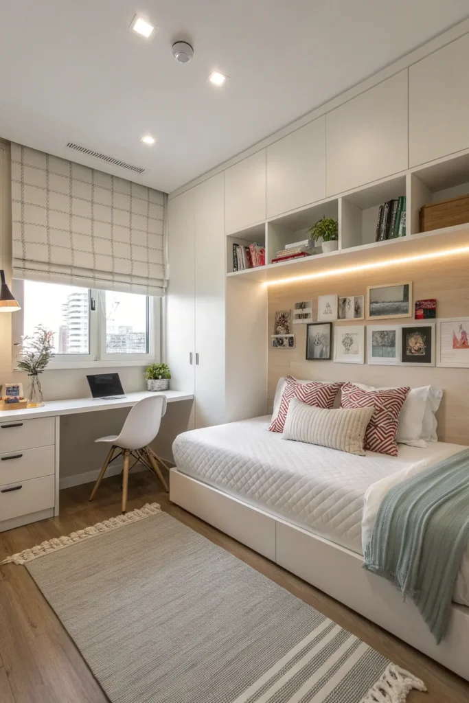 A modern cozy bedroom blends sleek design with comfort. In a small space, this might mean a platform bed with built-in storage, neutral walls, and minimal décor accented with warm tones like beige or soft brown. LED strip lighting behind the headboard or shelves adds a soft glow without taking up space. The result is a stylish yet comfortable room that feels mature and calming for teens.