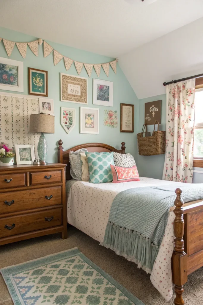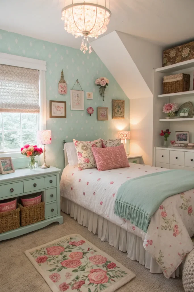 A cottage-style bedroom brings warmth and charm to a small teen space. This style features soft florals, vintage-inspired accents, and cozy fabrics. A simple iron or wooden bed frame paired with layered bedding creates a snug feel. Wall-mounted hooks, baskets, and shelves provide storage while adding character. The overall look feels comforting, nostalgic, and perfect for teens who love a soft, homey atmosphere.