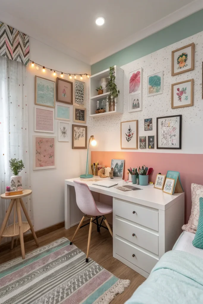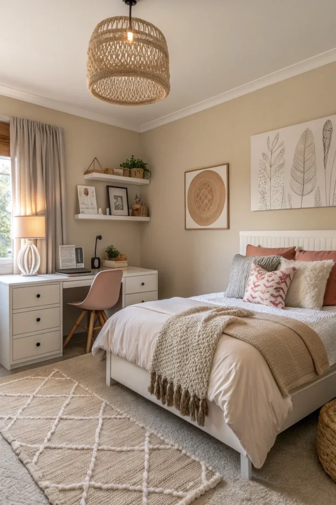 Boho style is perfect for teens who love creativity and self-expression. In a small space, it shines when layered thoughtfully. Macramé wall hangings, patterned throw pillows, and a mix of earthy colors create warmth without overwhelming the room. Low-profile furniture helps keep the space open, while string lights or lantern-style lamps add a cozy glow. Plants, even faux ones, bring life and softness to the room.