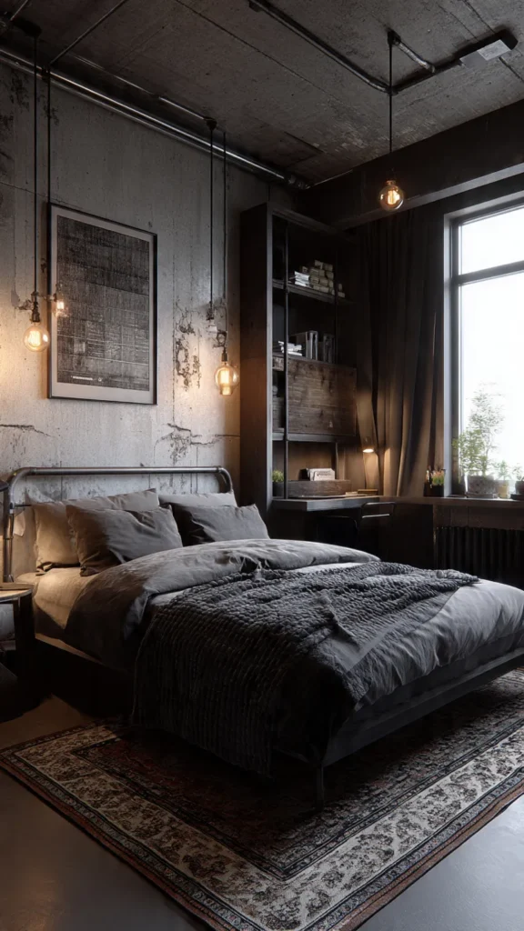 Industrial style can still feel cozy when softened for a teen’s small bedroom. This look includes elements like metal bed frames, exposed-style lighting, and darker accents, balanced with warm textiles. Soft bedding, layered throws, and a plush rug keep the room from feeling too harsh. Neutral walls and minimal décor ensure the space remains open and comfortable rather than heavy.