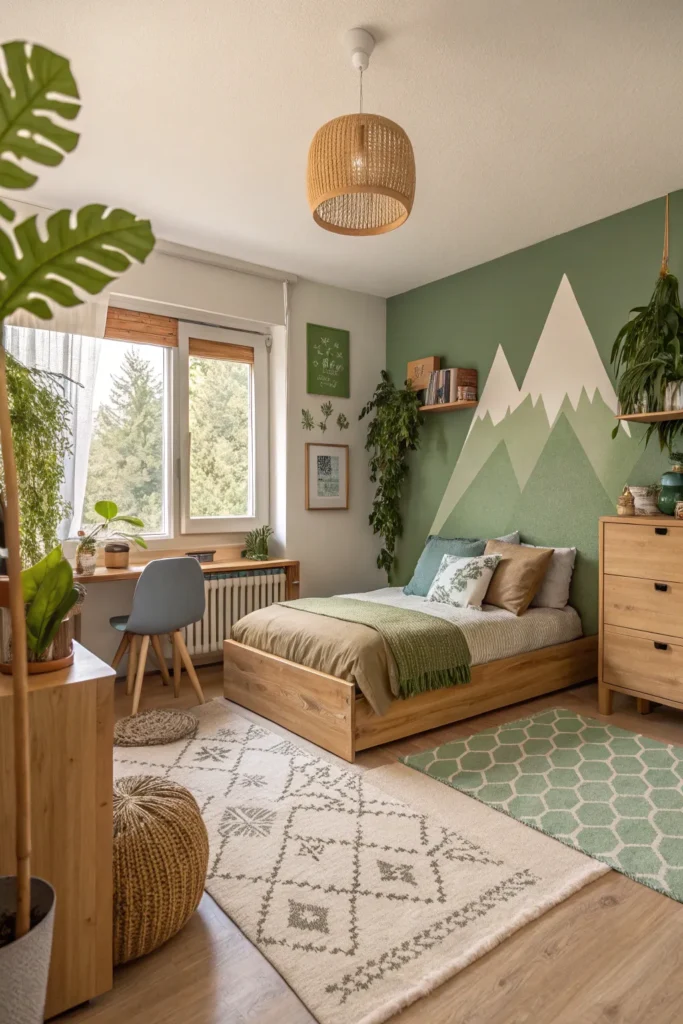A nature-inspired bedroom brings the outdoors in, creating a calming retreat for teens. Earthy tones like green, beige, and soft brown work well in small spaces. Wooden furniture, botanical prints, and plant-themed décor add warmth without overwhelming the room. Cozy bedding, natural fiber rugs, and gentle lighting complete the look, making the bedroom feel restful and grounded.