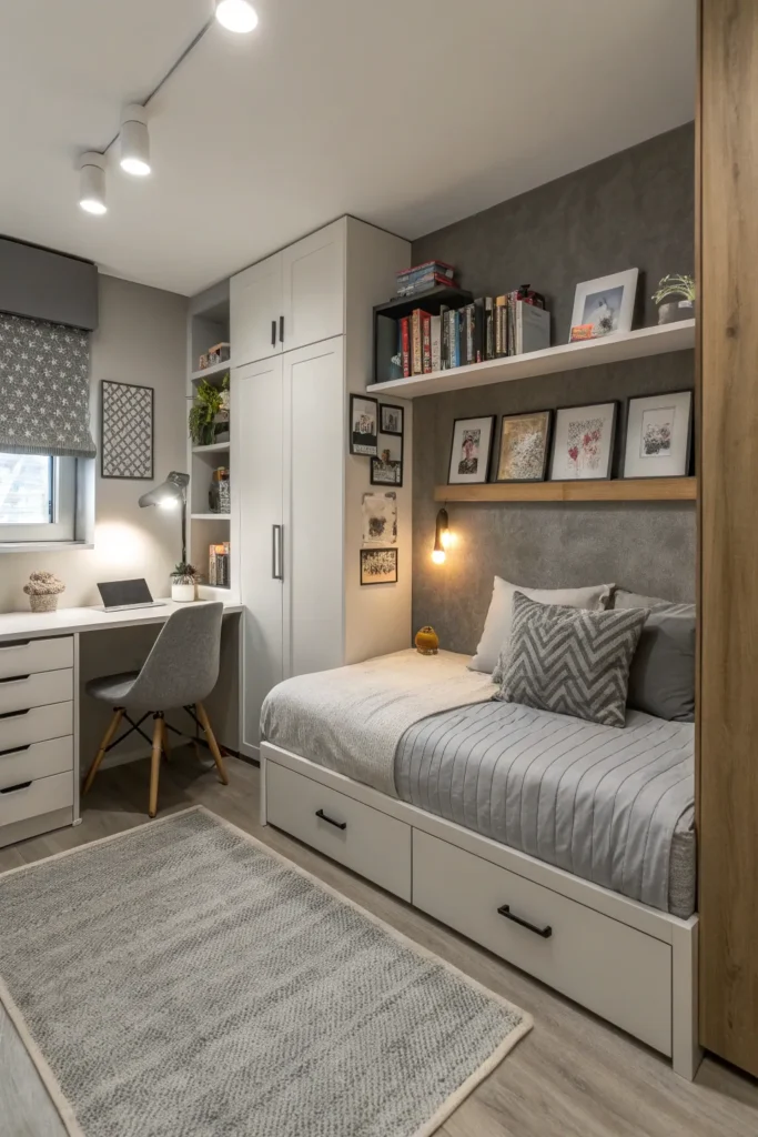 Scandinavian design emphasizes simplicity, light, and comfort, making it ideal for small bedrooms. This style uses a soft color palette of whites, grays, and pale wood tones to make the room feel larger. Cozy textiles such as knit blankets, fluffy rugs, and linen bedding add warmth. Smart storage solutions, like under-bed drawers or wall-mounted shelves, keep the room tidy while maintaining a relaxed, welcoming vibe.