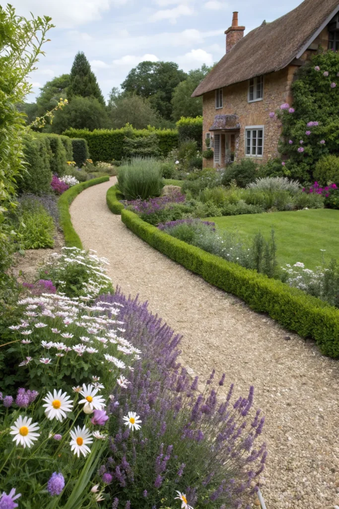 Edge the path with lavender, daisies, or boxwood to soften the curves and frame the walkway. Choose natural crushed gravel for that rustic, English-cottage feel.