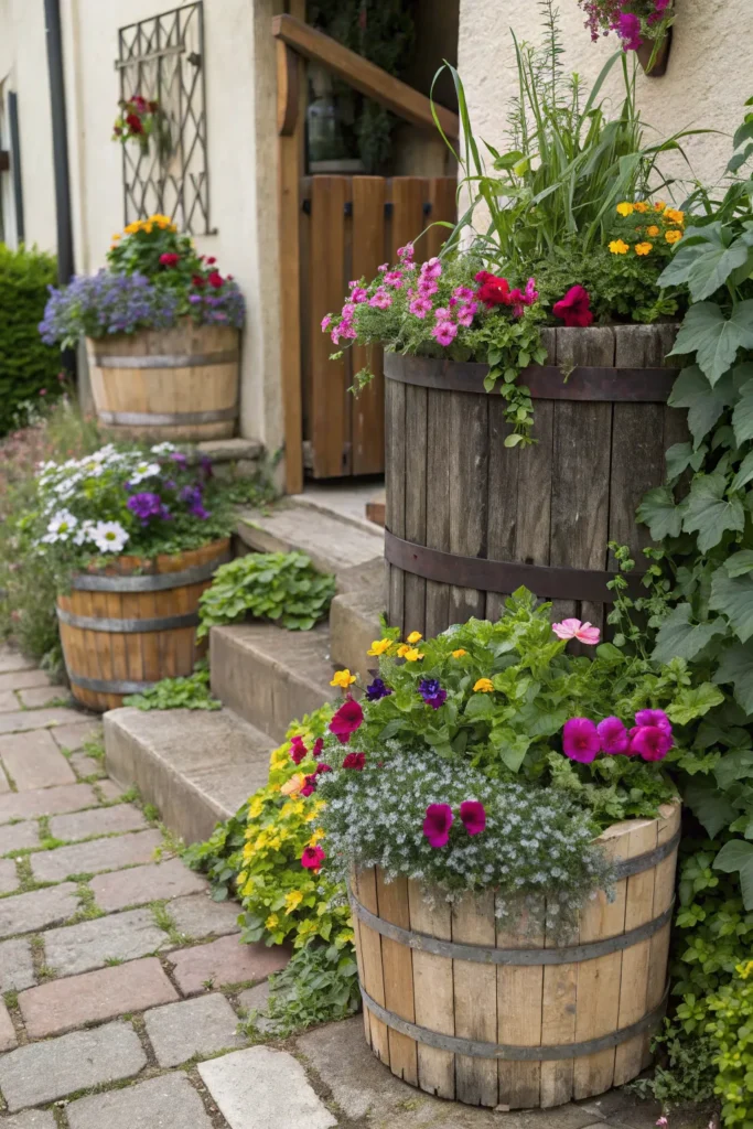 Arrange two or three at different heights to create depth in a tiny garden. Fill with snapdragons, pansies, and trailing ivy for a layered, charming effect.