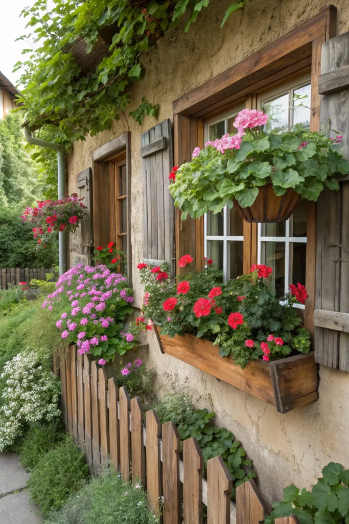 Fill with geraniums, petunias, and trailing lobelia for a classic English look. Choose wooden or wrought-iron boxes to keep the aesthetic authentic and romantic.