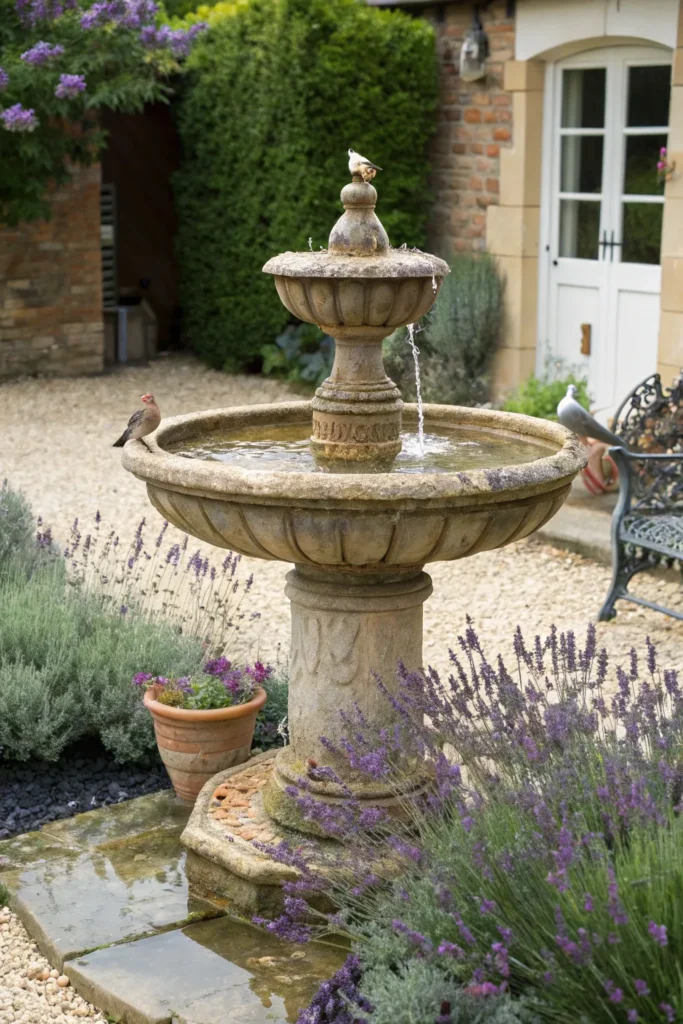 Choose stone, terracotta, or aged metal finishes for rustic charm. Surround with lavender and soft groundcover for a natural, tucked-in feel.