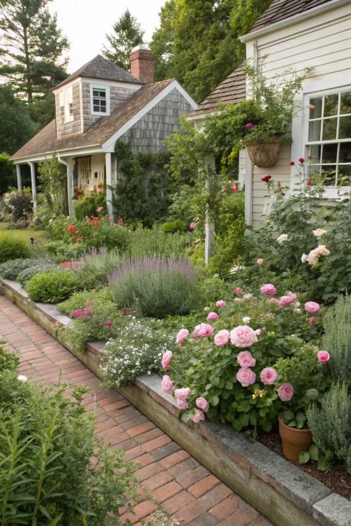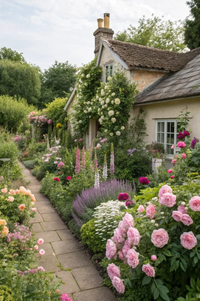 Mix soft colors like pink, cream, lilac, and yellow for a dreamy, romantic look. Plant roses, foxgloves, peonies, and yarrow to build that iconic cottage charm in a compact footprint.