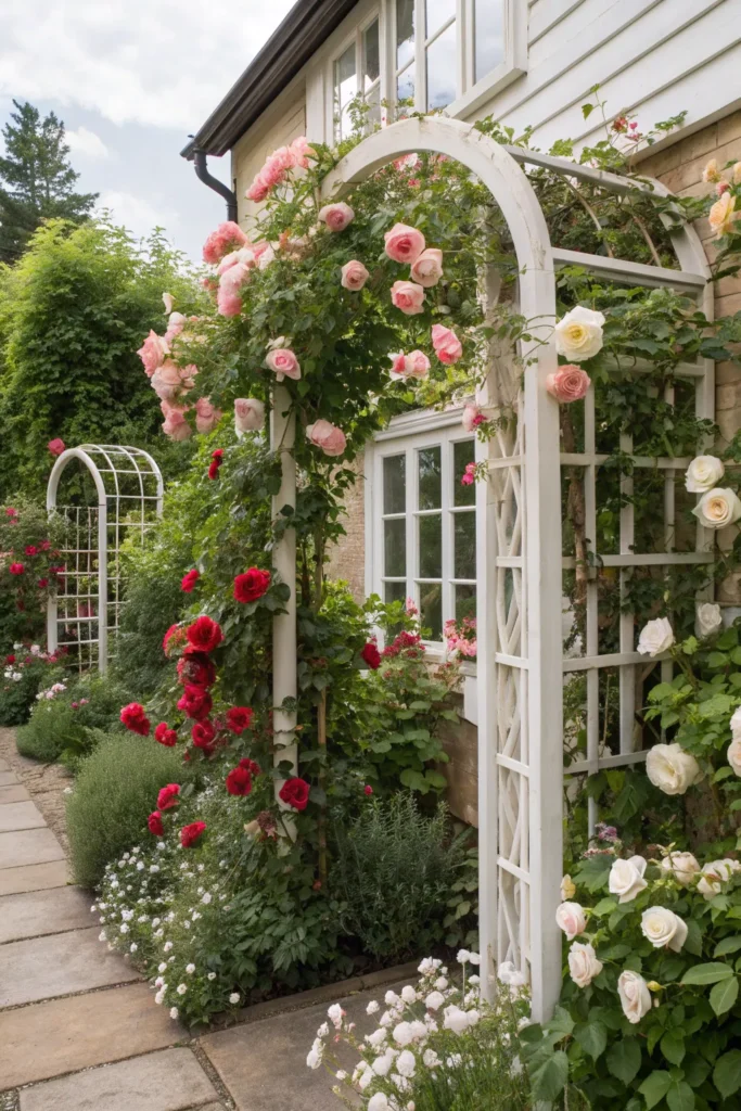 Choose pale blush, creamy white, or rich red roses depending on your garden palette. Add a white wood trellis for classic English charm or metal for a modern cottage twist.