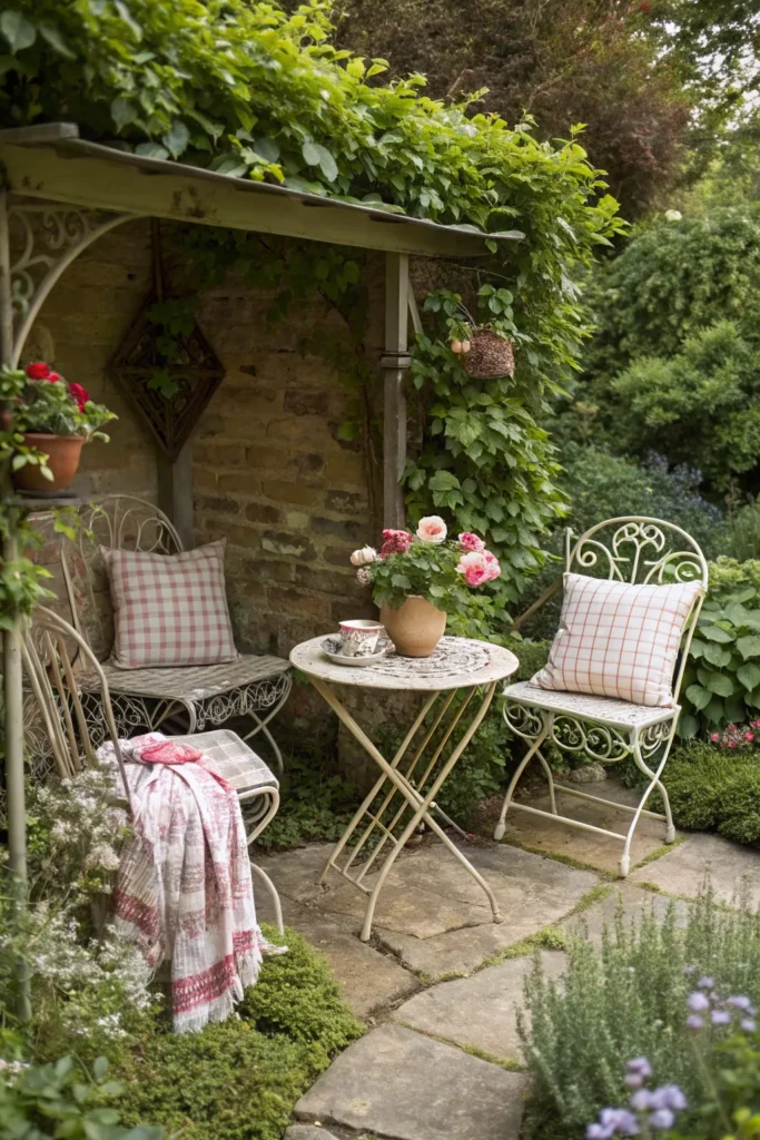 A tiny bistro table or a pair of weathered metal chairs instantly creates a romantic sitting spot. The small scale fits perfectly in compact gardens while adding timeless charm.