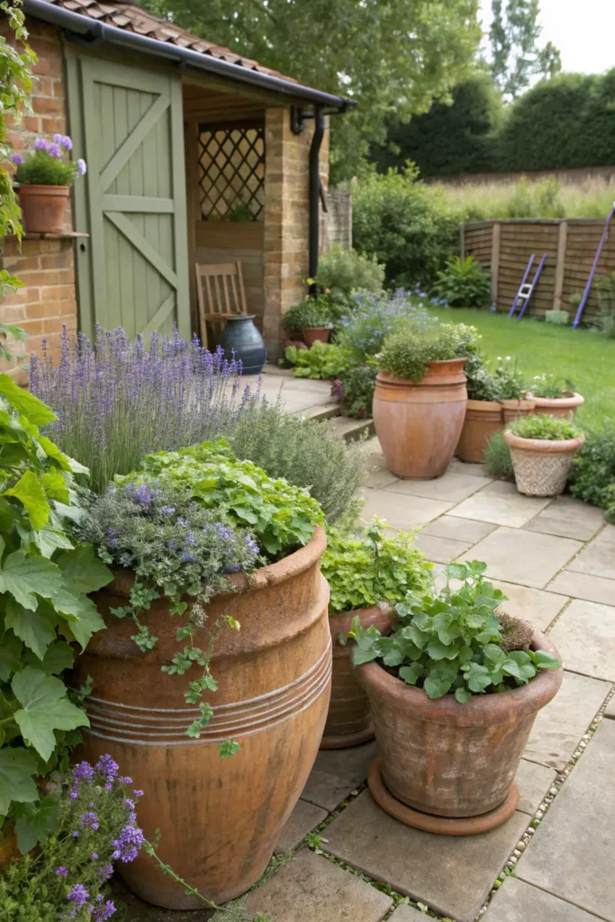 Fill them with lavender, mint, climbing ivy, and trailing lobelia for a soft cottage look. Aged terracotta brings even more texture and authenticity.