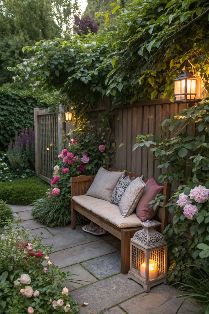 A small wooden bench tucked against a fence or hedge creates a peaceful reading or tea spot. Surround it with lush greenery and flowers to feel embraced by nature.