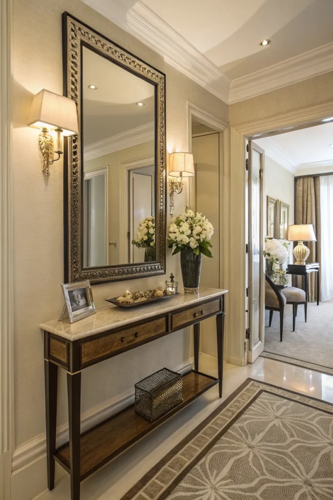 A slim console instantly creates a polished entry, offering just enough space for keys and décor. Pair it with a tall mirror to reflect light and visually open up the hallway.