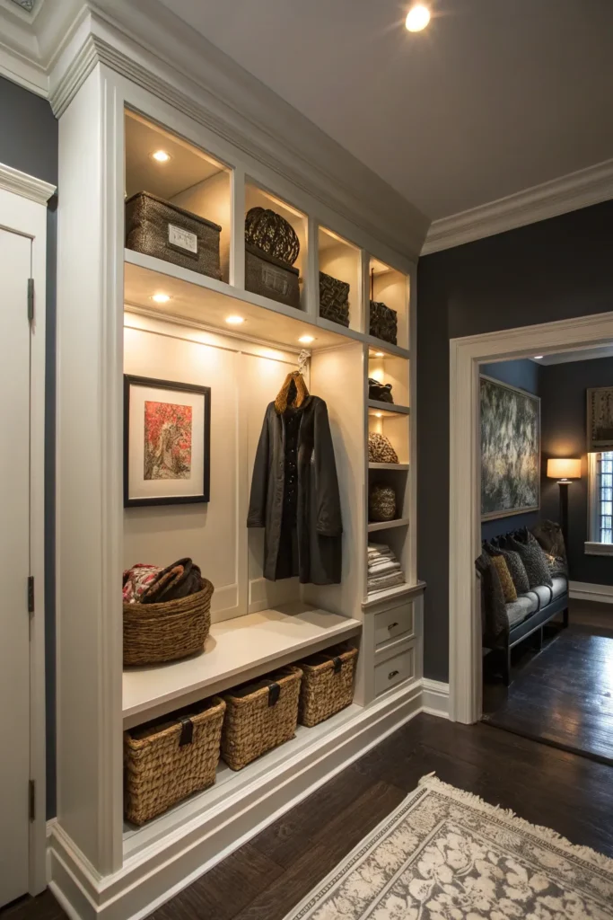 If you have a shallow closet, turn it into a decorative niche with built-ins or open shelving. Add lighting, art, and baskets for stylish organization.