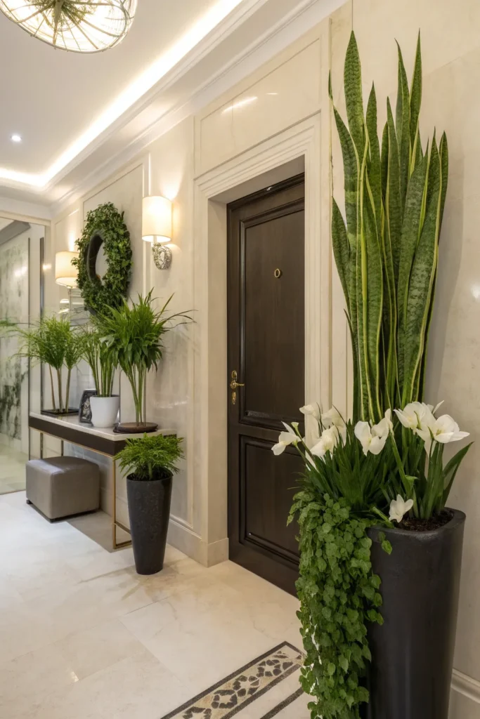 Opt for low-maintenance varieties like snake plants or peace lilies. Greenery softens hard edges and brings a spa-like calm to your entrance.