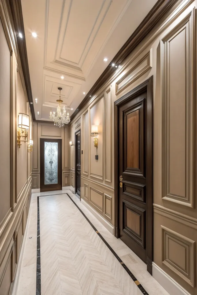 Paint panels in soft neutrals or dramatic dark tones for modern luxury. This approach gives small halls structure and high-end appeal.
