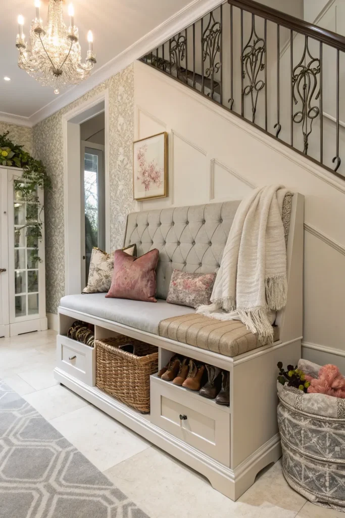 A compact bench provides seating for shoes and boots while keeping clutter tucked away. Choose one with lift-top storage or built-in baskets.