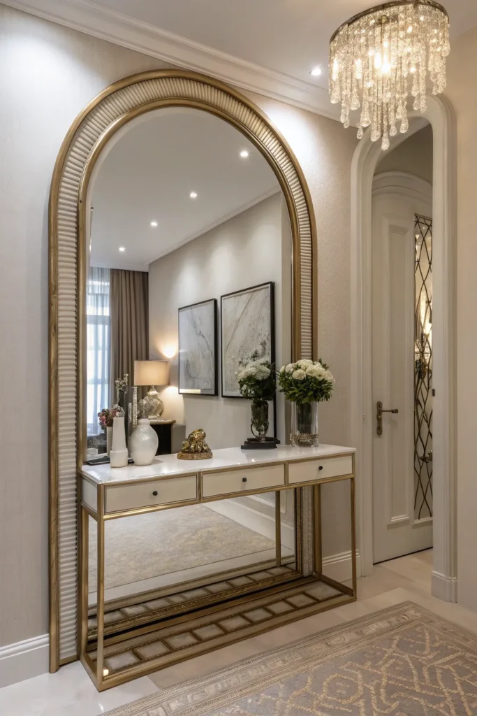 An arched mirror softens the space and instantly makes it feel taller and brighter. It adds architectural interest, especially in narrow halls.