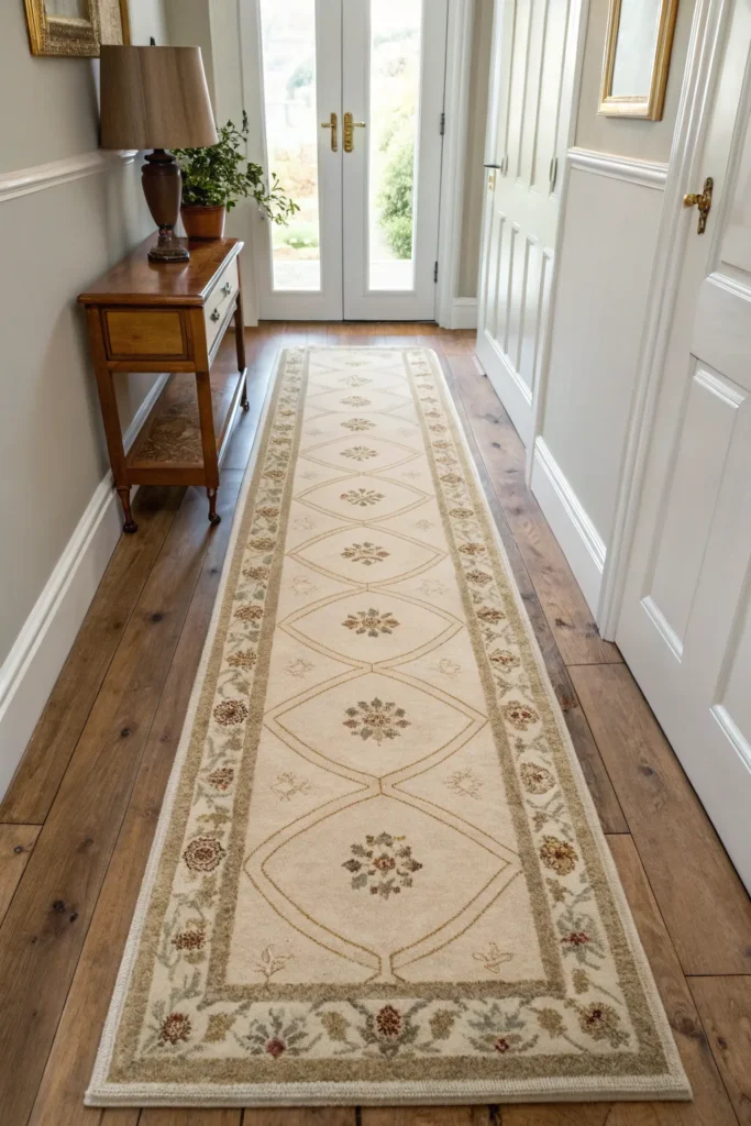 A long rug anchors the hall and adds warmth and texture. Choose a plush runner in soft tones or subtle patterns for a cozy, elegant welcome.