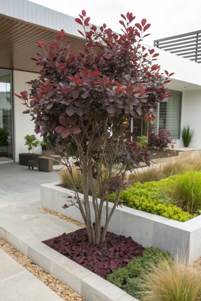For a striking look, the smoke tree offers unique texture and color.