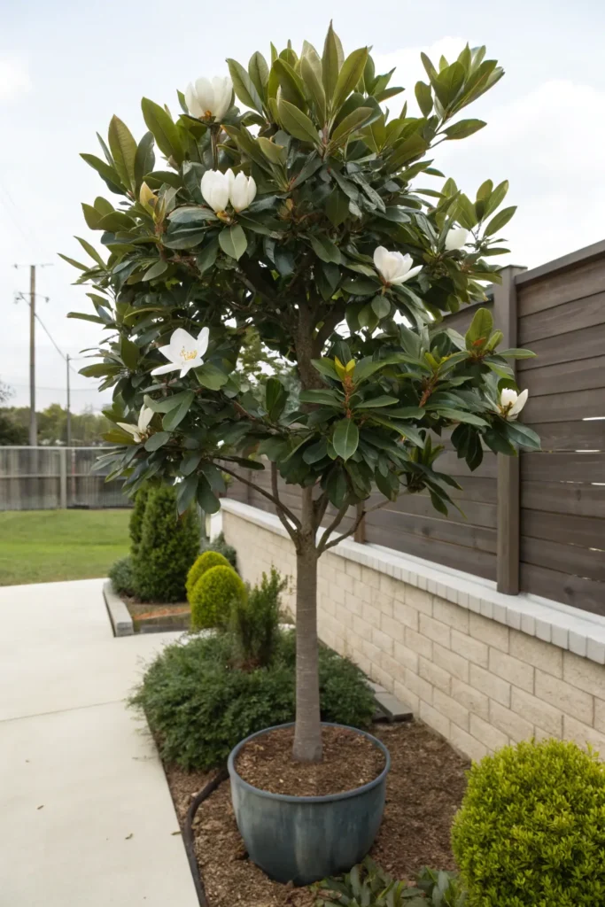 - Compact size (15–20 feet) with deep green glossy leaves