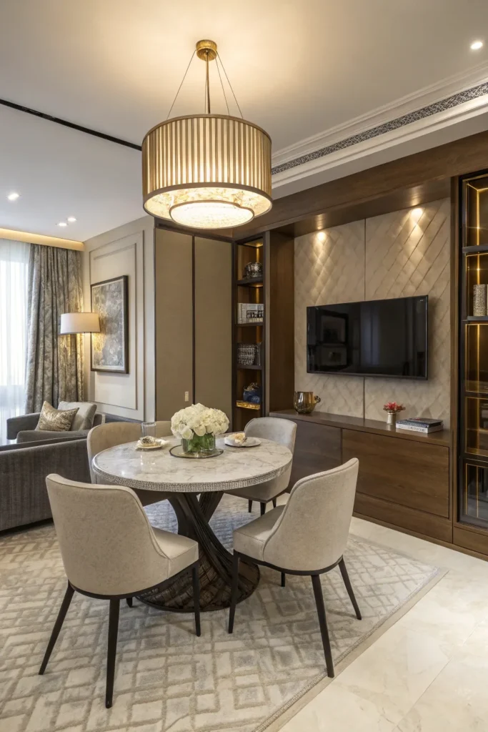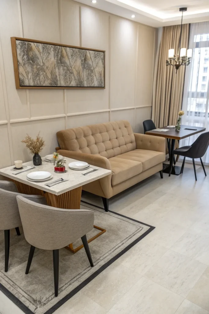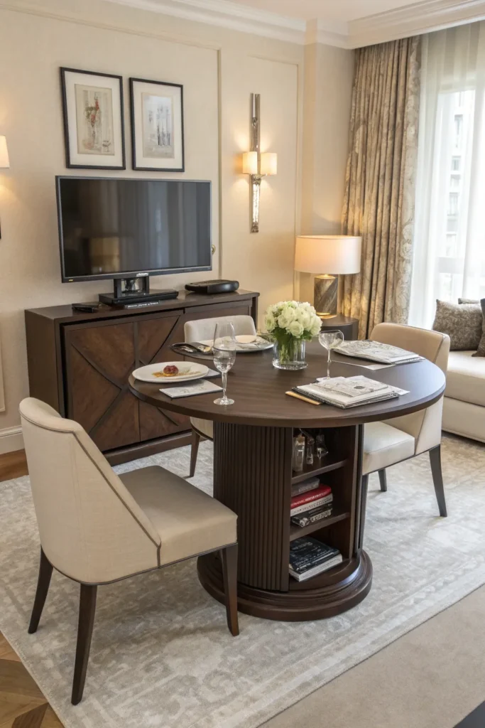 In a small living room, your dining table should serve multiple purposes. Look for small round tables, drop-leaf tables, or extendable sets that can expand only when needed. These save space during the day and offer full dining function at mealtimes. Multi-use tables can also work as a desk, snack bar, or additional kitchen prep surface.