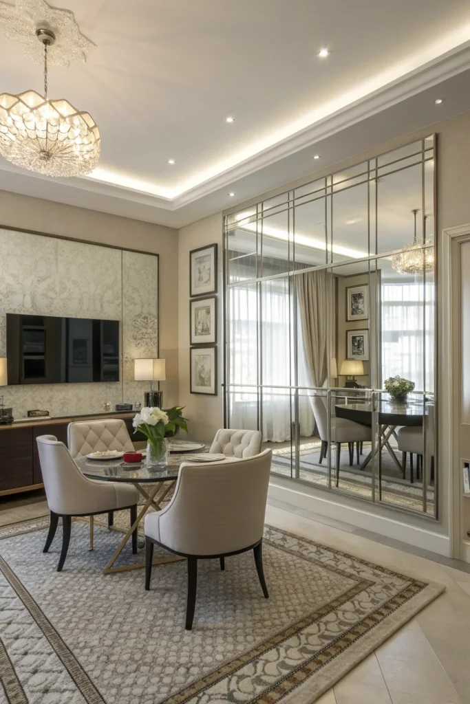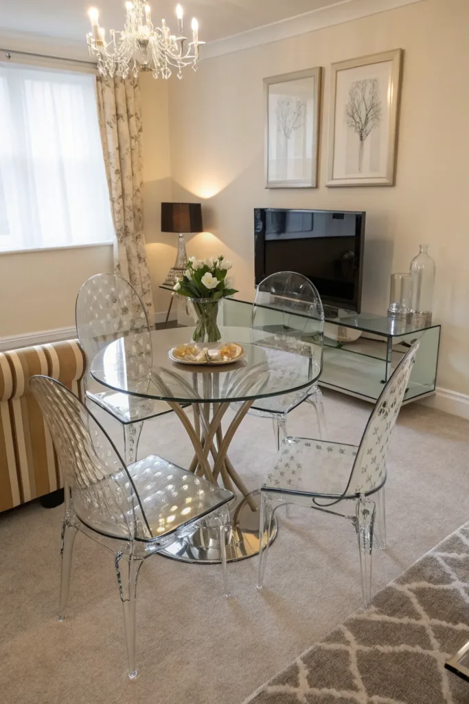 Glass dining tables, acrylic chairs, or glass coffee tables create a lighter visual footprint in small rooms. They maintain functionality while keeping the area feeling open and uncluttered. Transparent furniture blends into the background, making space appear larger.
