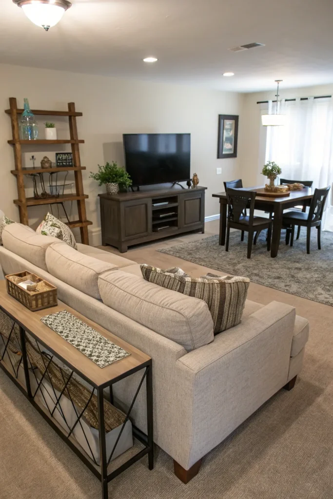 A practical layout is to place your sofa facing the TV, with the dining table positioned behind the sofa. This arrangement clearly separates living and dining zones without walls. A console table behind the sofa can also hold decor or serve as extra dining storage.