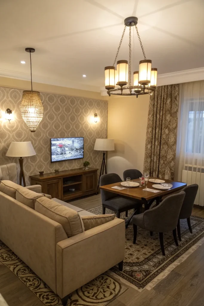 Use multiple lighting sources such as floor lamps, pendant lights over the dining table, wall-mounted sconces, and table lamps near the sofa. Layered lighting highlights different zones while keeping the space warm and inviting. It also helps ensure both your TV area and dining zone have the right amount of illumination.