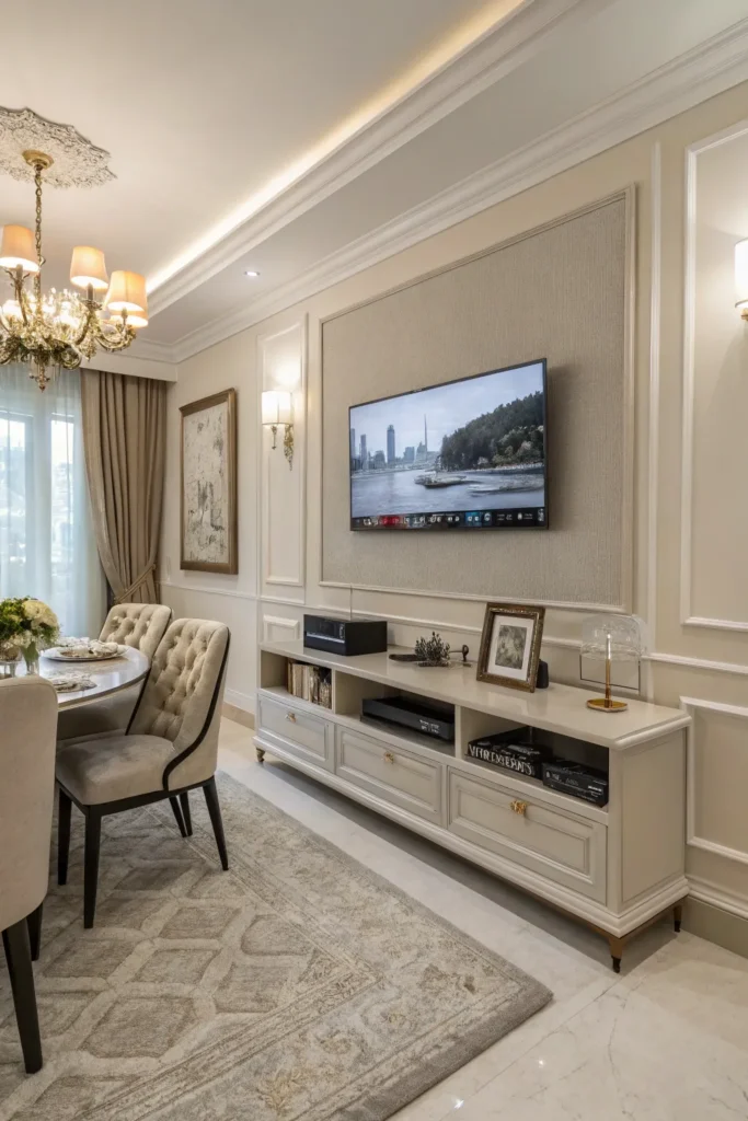 If your dining table sits near your TV wall, consider integrating both functions into one sleek storage system. A wall unit that includes shelves for media items, a spot for the TV, and cabinets for dishes will keep everything within reach while reducing clutter.