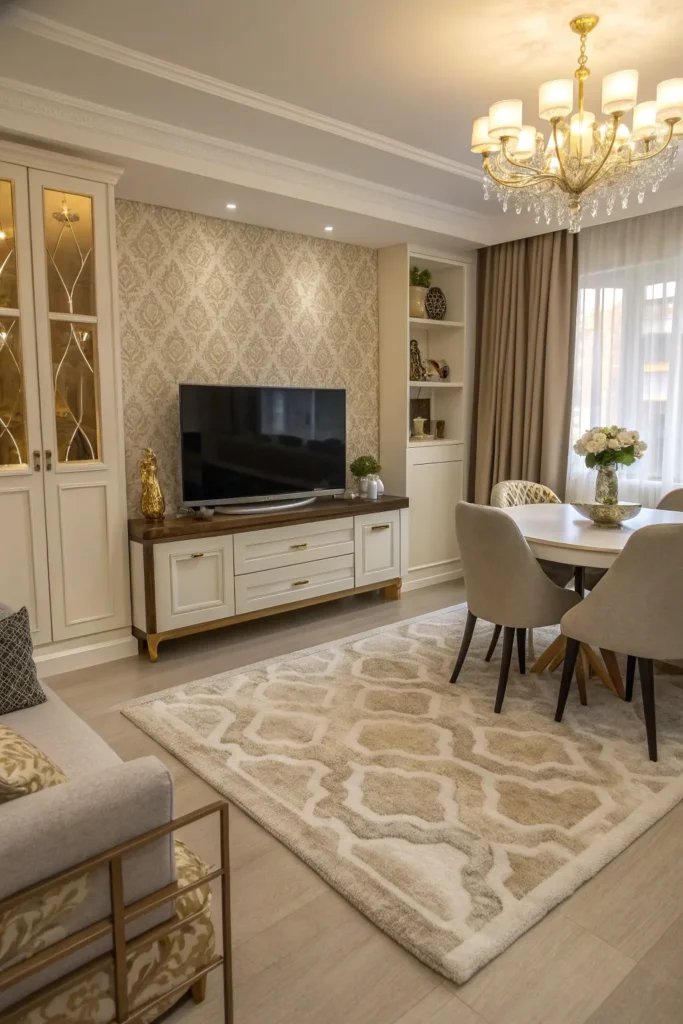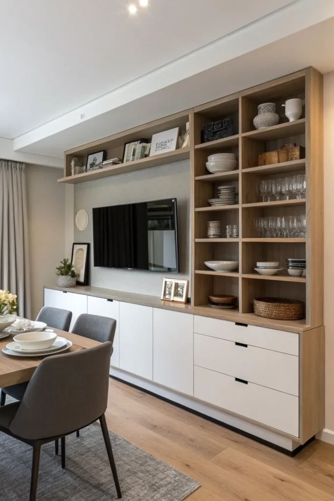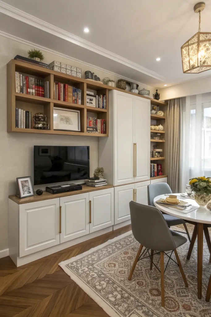 Floating shelves, tall cabinets, and mounted storage units help keep the floor clear. Use vertical storage for books, decor, and dinnerware, leaving more space for your TV and dining setup. This protects your limited floor area while still providing plenty of storage.