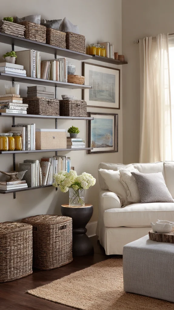 Built-in shelving that runs from baseboard to ceiling, floating shelves installed in columns rather than single rows, pegboard systems on utility room or kitchen walls, tall freestanding bookcases and armoires that claim the full vertical dimension of a room — all of these interventions convert unused wall space into functional storage without removing a single square foot of floor area from the living environment.