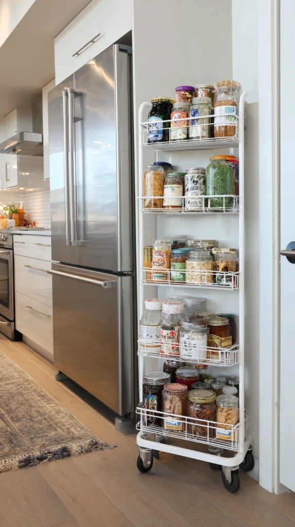 The rolling cart — narrow, tall, fitted with several shelves, and mounted on lockable wheels — is one of the most versatile storage tools available to the basement-free homeowner, because it exploits the slim vertical gaps between and beside furniture that are otherwise completely wasted. A slim rolling cart between the refrigerator and the kitchen wall holds spice jars, canned goods, or cleaning supplies in a space that would otherwise contribute nothing.
