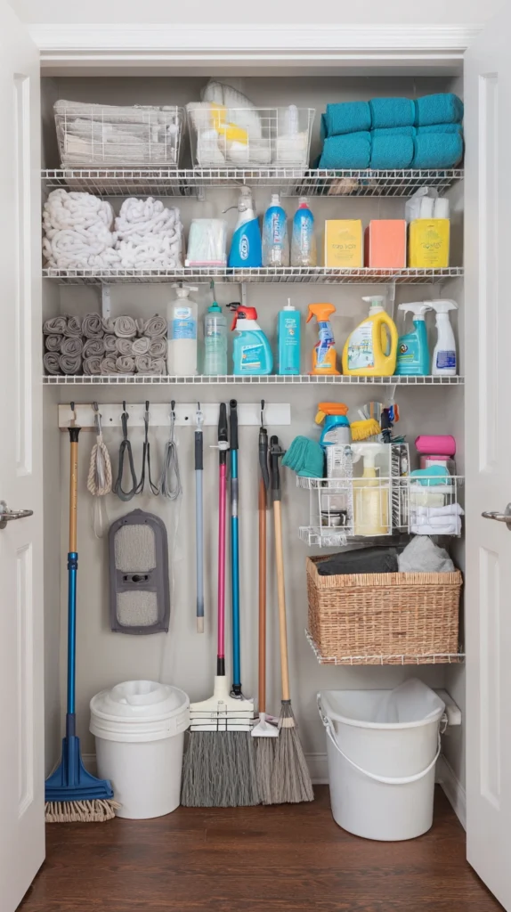 The key is treating this closet with the same organizational seriousness you would bring to any other storage system in the house — fitted shelving at appropriate heights, hooks on the back of the door for mops and brooms, labeled bins for different supply categories, and a clear organizational logic that makes everything findable in the thirty seconds between deciding you need it and needing it.