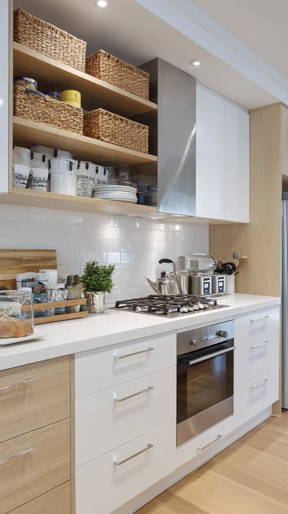 The key is containment: open stacks of random items above cabinets look chaotic, while identical baskets or clearly labeled bins look intentional and can even contribute positively to the kitchen’s visual character. Add a small step stool to the kitchen’s storage toolkit and this elevated zone becomes genuinely accessible rather than theoretically available.